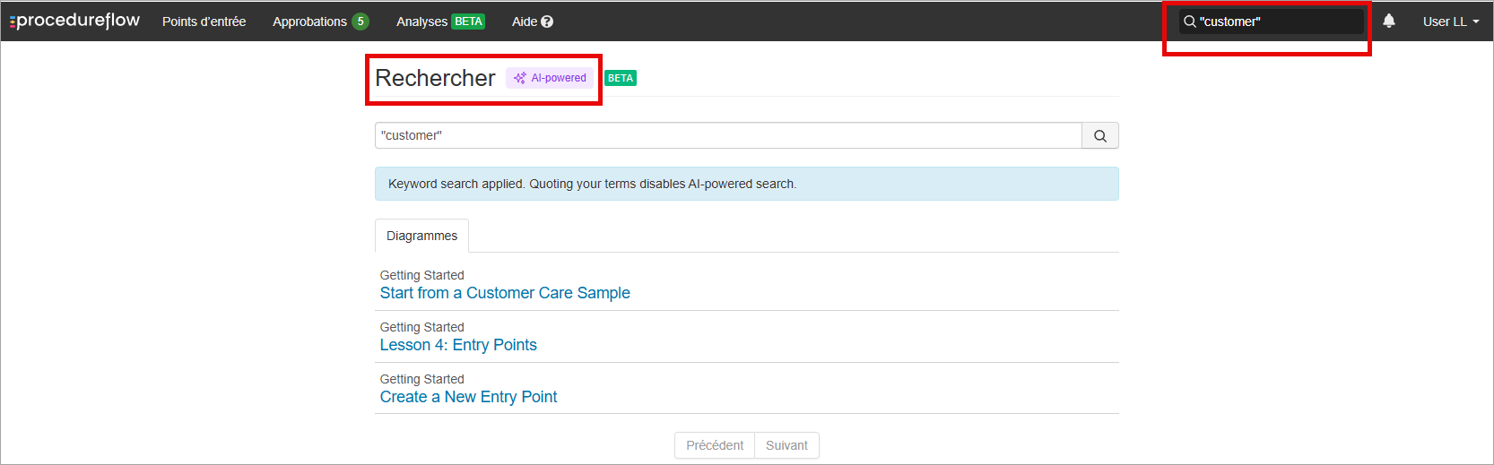 La recherche IA est actuellement en version bêta. Contactez Procedureflow pour y accéder. N’hésitez pas à envoyer vos commentaires via le formulaire ide rétroaction..